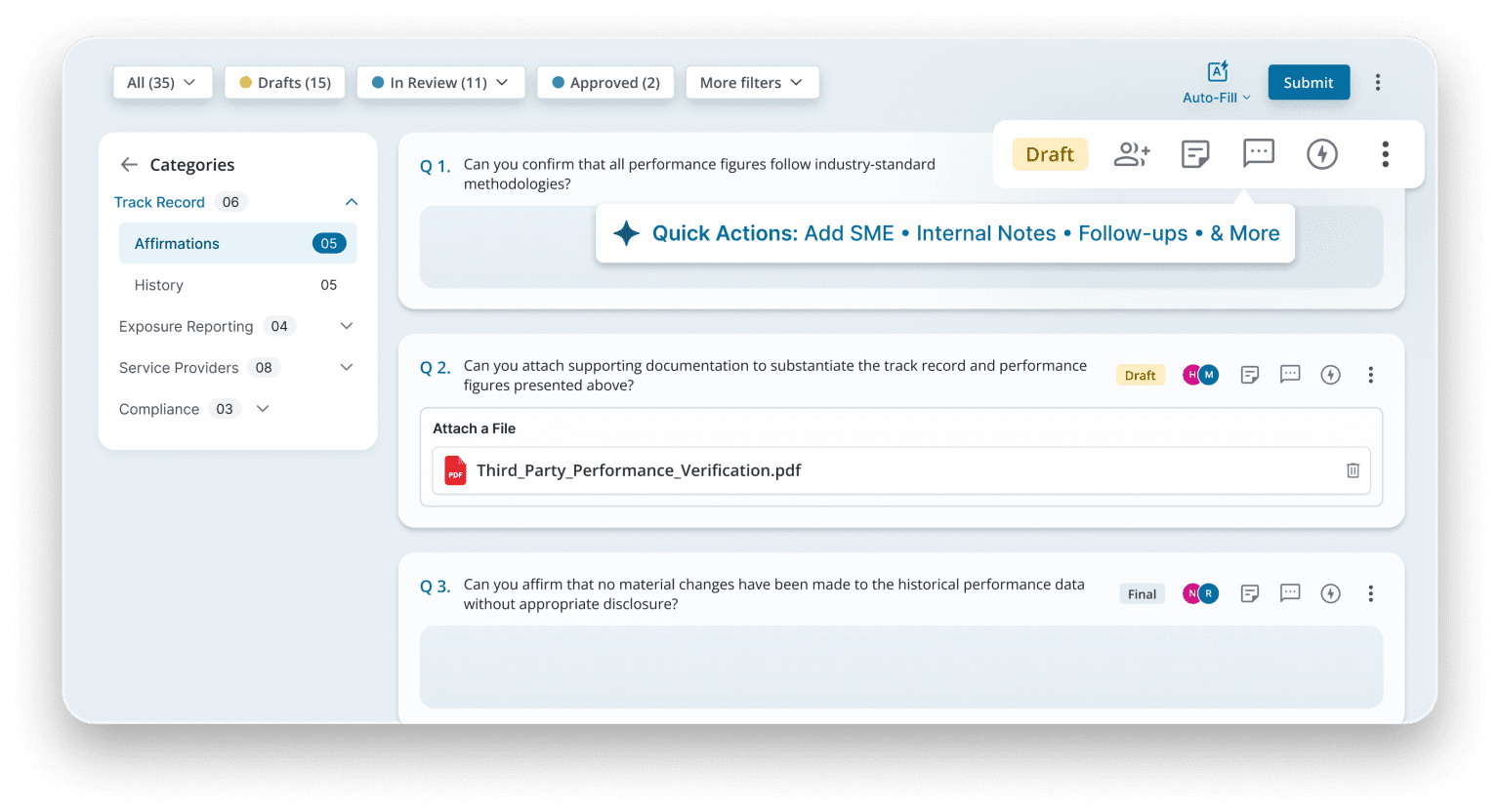 Automate creation of standard DDQ using ILPA, AIMA, INREV standards, and respond to DDQ/RFPs with AI-powered workflows