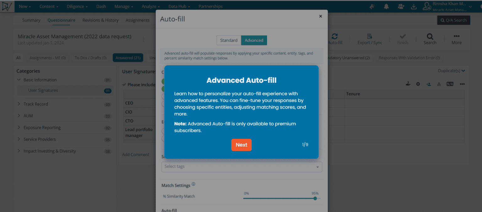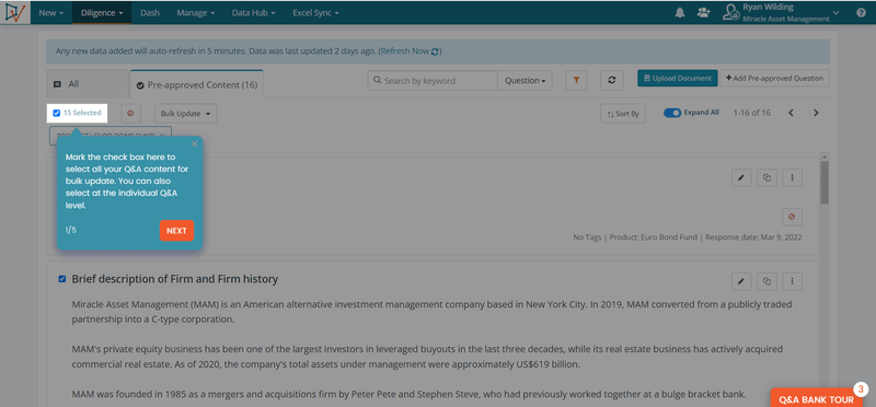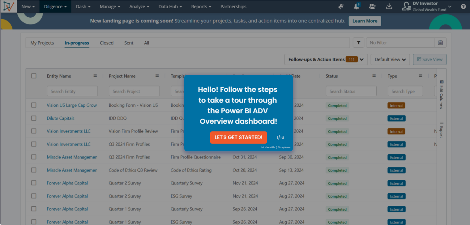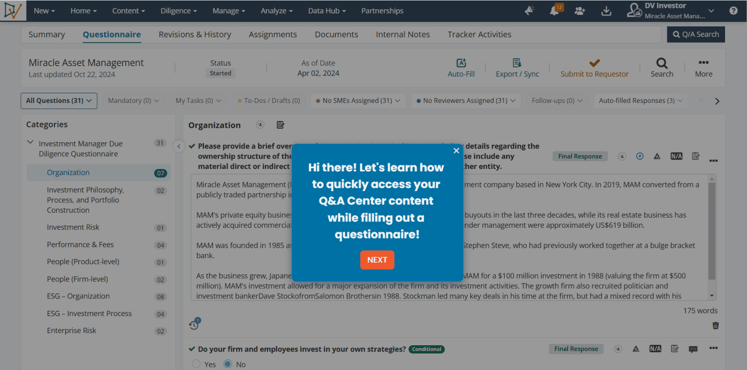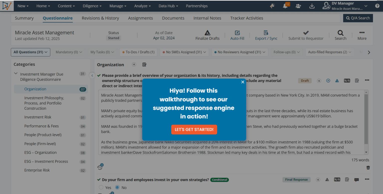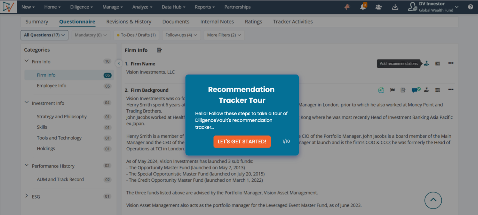 Explore DiligenceVault’s interactive product tours and try out several key